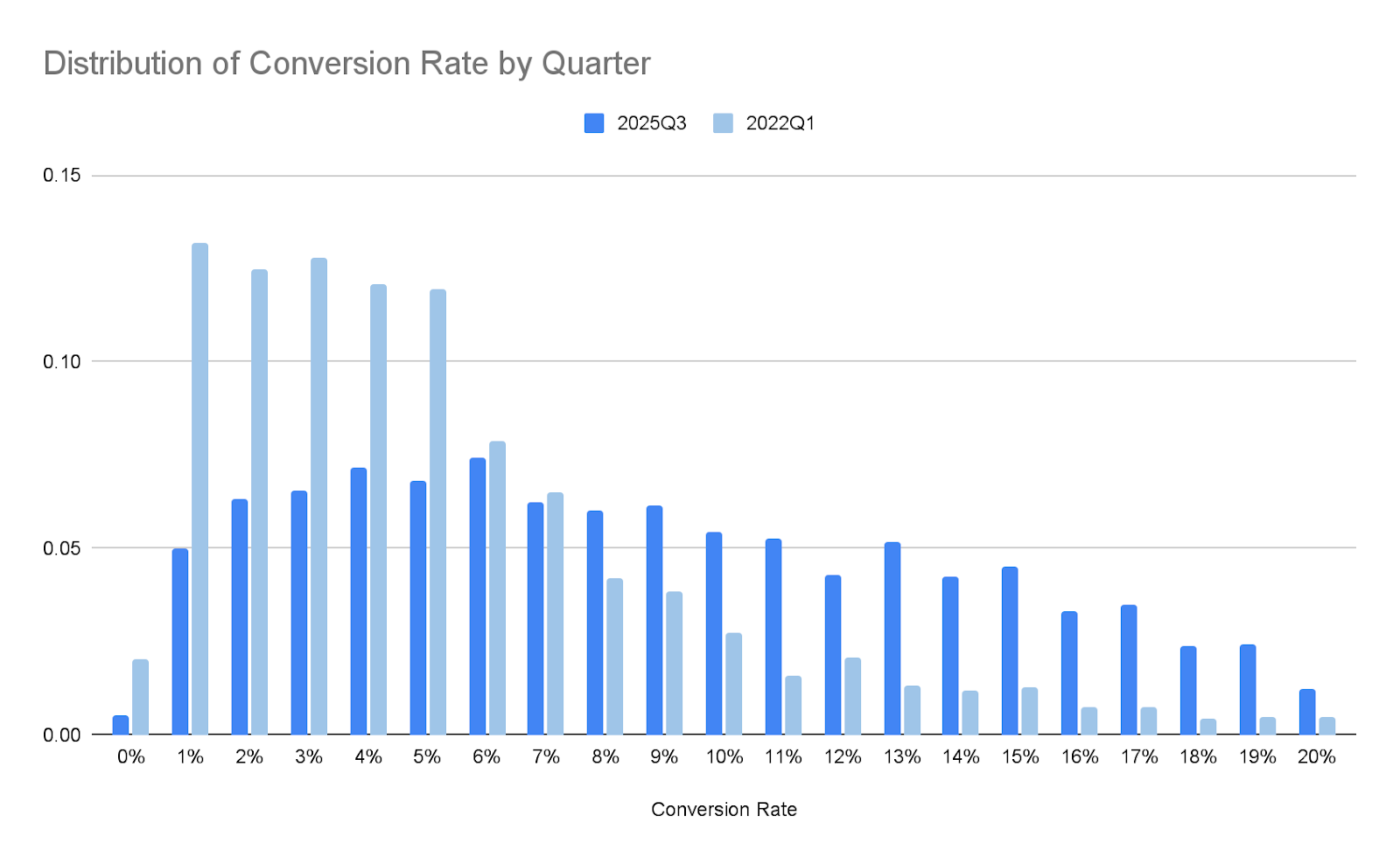 The entire distribution of the industry has shifted. Back in 2022, most locations were in the sub 5% range (see how left-skewed the light blue bars are?). Now, it’s an even spread, and the average performer is between 7 and 10%.