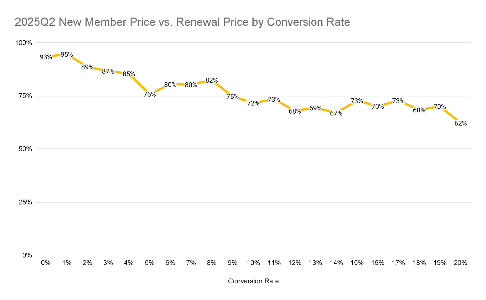 Pricing is the lowest hanging lever to pull. The chart below shows, by conversion rate, the ratio of new member price to renewal member price (100% = no locations are running promotions, 50% would mean on average they are running half off prices).